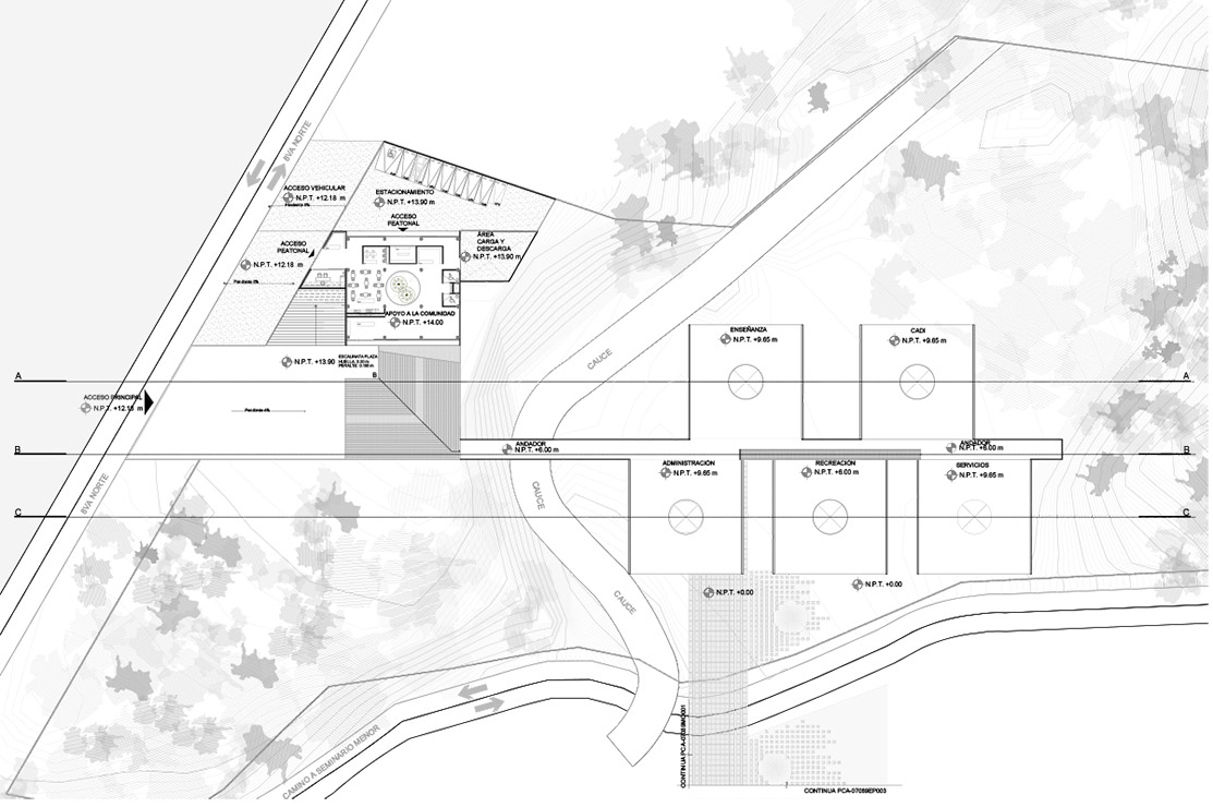 El ingreso principal al CDC se ubica en el frente a la Avenida 8va Norte. Desde la plaza de acceso se accede al foro al aire libre, junto al cual se ubican unas escalinatas que permiten acceder a la terraza del módulo de Apoyo a la Comunidad y, a la vez, favorecen la estancia de los usuarios y la realización de actividades culturales al aire libre. Todos los módulos, con excepción de Apoyo a la Comunidad, se ubican en la terraza norte del predio en una cota inferior que el acceso, y están soportados sobre pilotes; esto permite la infiltración de agua pluvial y el aprovechamiento del suelo con zonas resguardadas del sol y la lluvia. El acceso a los módulos se realiza a través de un pasillo central elevado, que favorece las vistas lejanas y la observación de la naturaleza desde una mejor posición.
