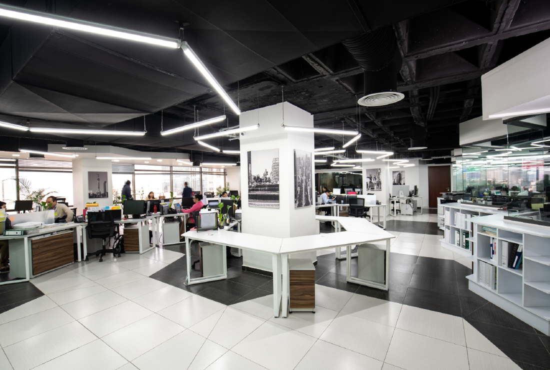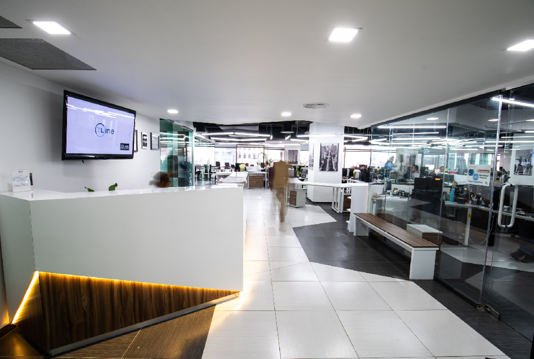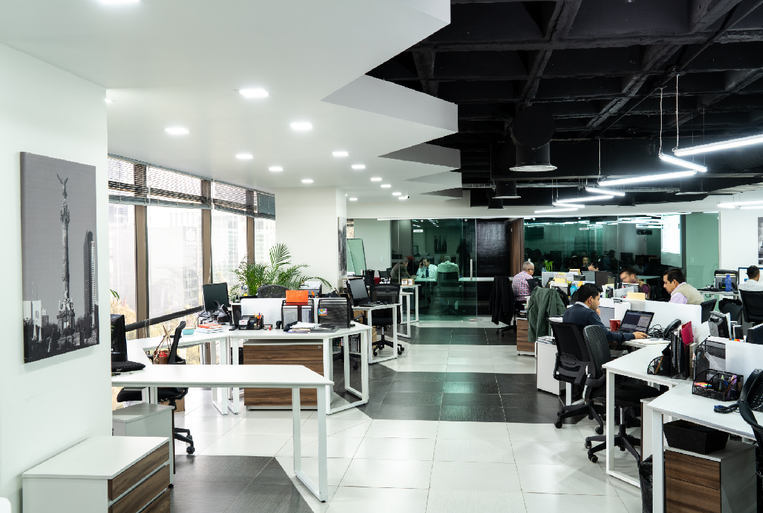 Desde el acceso principal se percibe claramente los materiales de alto diseño y la tecnología presente en la estancia, la paleta de colores que se seleccionó para todo el proyecto es sobria y predomina los colores neutros como el blanco y el negro, para crear ambientes luminosos y de amplitud, utiizando el material de porcelanato para el piso de la oficina. SPAZI pensó el diseño mobiliario modular para la interacción entre los trabajadores, con un estilo contemporáneo haciendo contraste el área de trabajo con iluminación en forma hexagonal con luz LED haciendo resaltar cada uno de los cubículos de esta forma creamos y optimizamos el área de trabajo, para que pueda crear un ambiente de flexibilidad en las instalaciones.