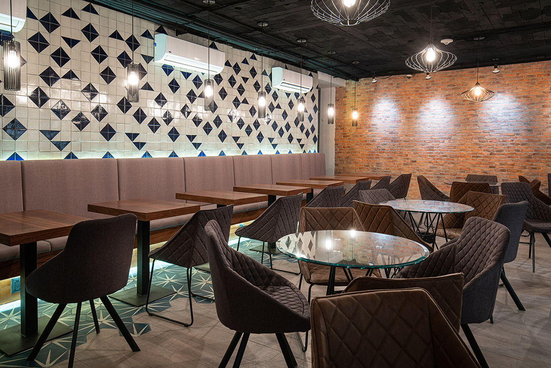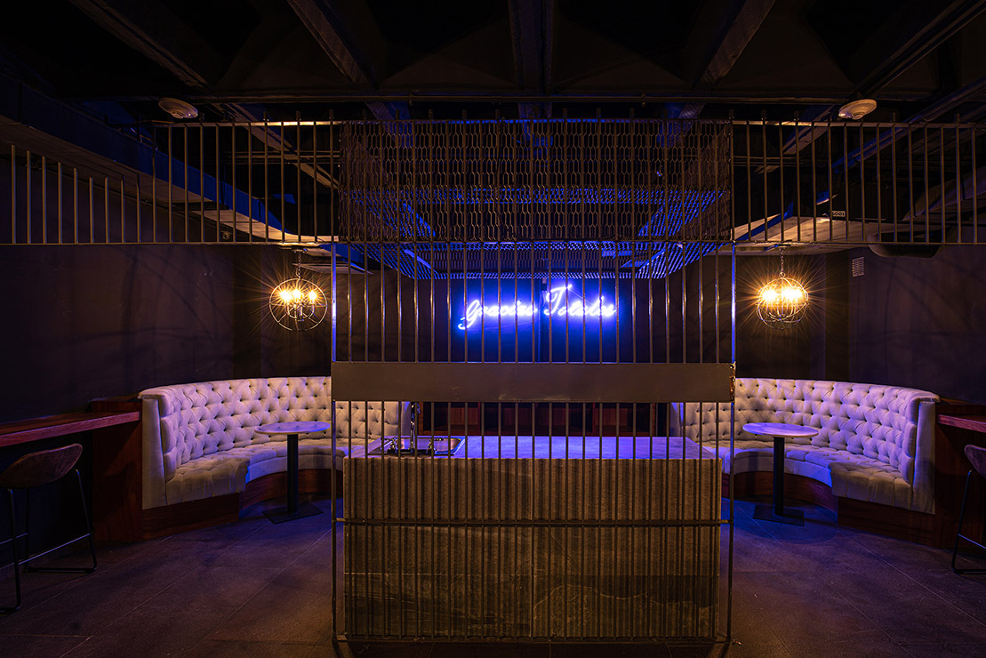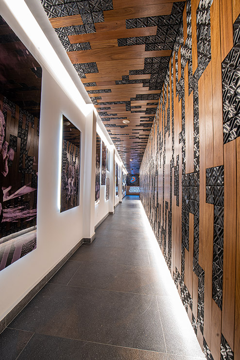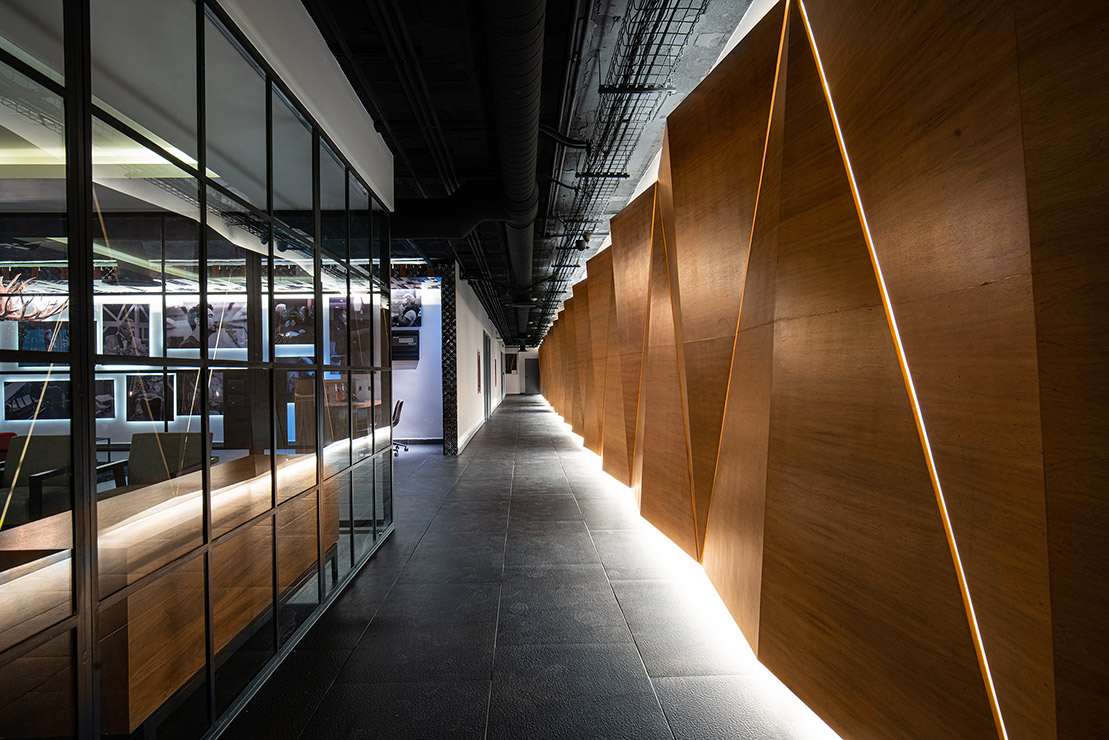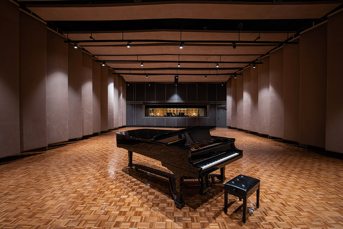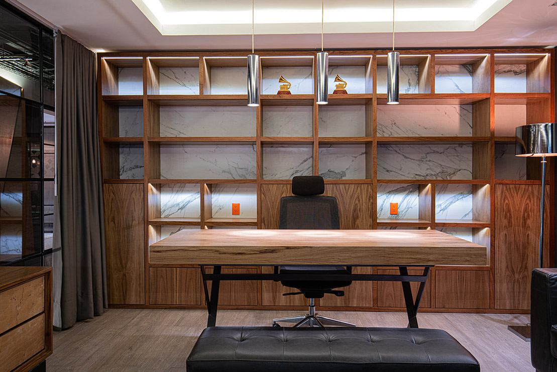 En cada espacio fue diseñado cada mueble en donde, se utilizaron materiales contemporáneos y en donde pensamos a través de la iluminación reflejar y apreciar una sensación de comodidad para los artistas. En el estudio se encuentra el pasillo que comunica las salas de grabación y se caracteriza por tener una iluminación indirecta, dramática, que sólo dirige la vista a través de las texturas en el lambrin de madera de tzalam sin duda un elemento que identifica el diseño del lugar, de igual manera una antigua bóveda se convirtió en un bar underground donde los artistas pueden brindar antes, durante y después de grabar en los estudios.