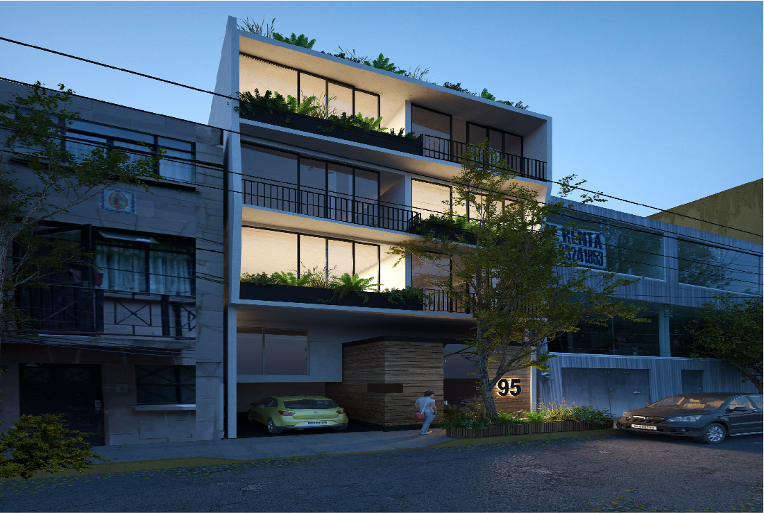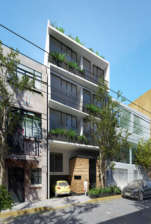 El Proyecto Residencial Santander ubicado en la colonia Nápoles, tiene una fachada moderna con una estructura contemporánea con madera y metal, una arquitectura que representa claramente el objetivo de su creación.