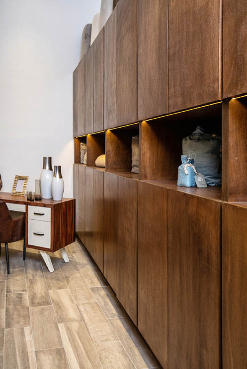 Iló Mérida, a lo largo de toda la tienda se pueden apreciar varios ambientes en diferentes sets que se generaron para hacer sentir una sensación de comodidad a través de la iluminación y materiales contemporáneos, en el cual un muro de fachaleta genera un contraste original para brindar a la atmósfera un remate visual con elegancia. Cada detalle de la tienda está planificado para crear una experiencia comercial para que los clientes se puedan sentir identificados con la marca y que cada espacio está pensado correctamente para que cada punto pueda transmitir un ambiente elegante y natural.