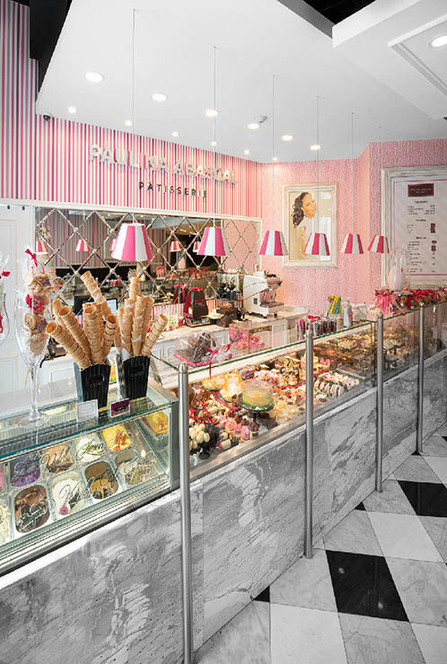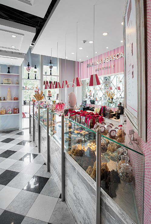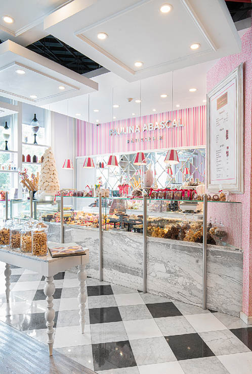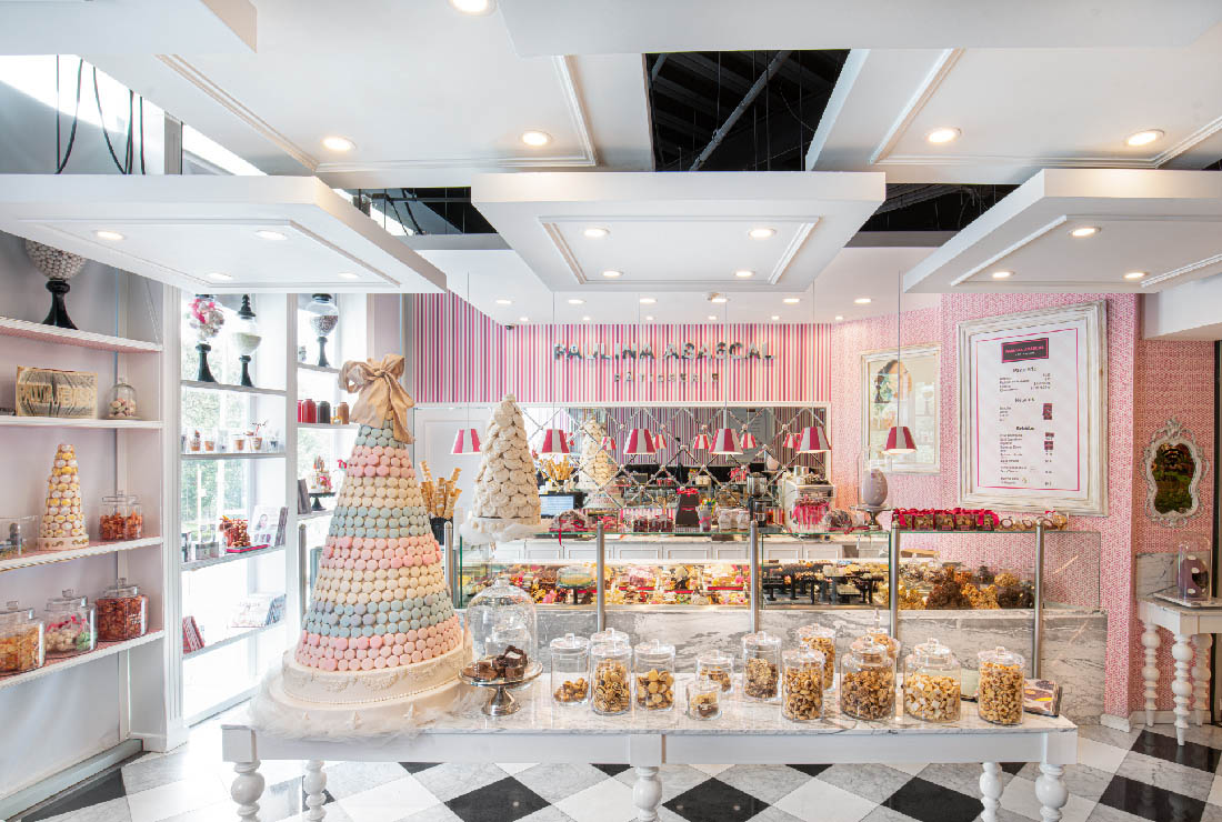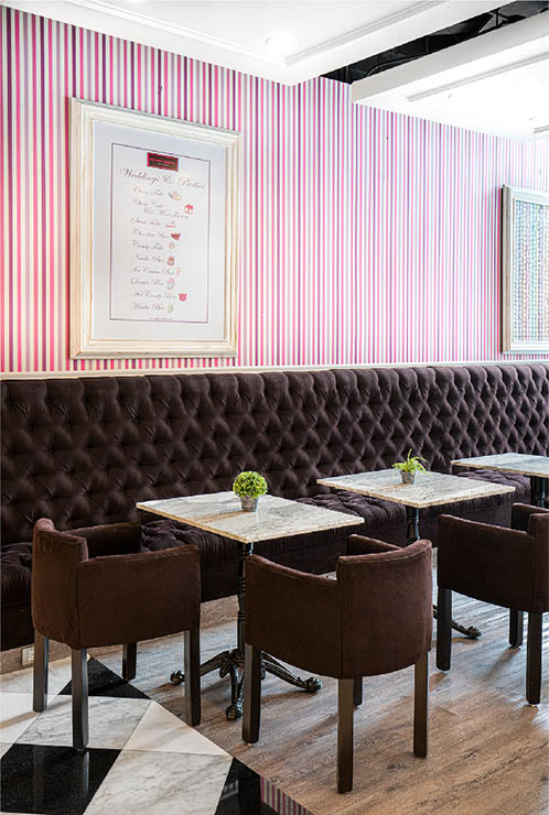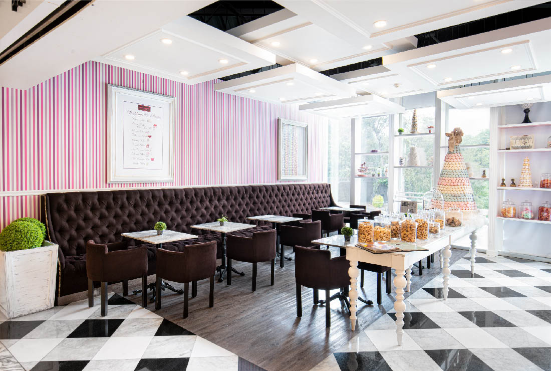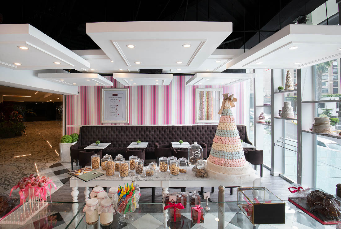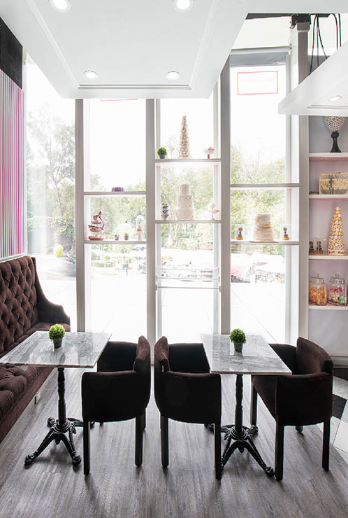 El lugar cuenta con una barra con utilización de marmol arabescato, acero cromado y cristal donde se puede apreciar la repostería desde la mayoría de las áreas del restaurante todo con el fin de que los comensales disfruten de la sofisticación del lugar, el área para los comensales cuenta con la utilización del mármol arabescato en las mesas en el cual hace conjunto con la barra de pasteles, la combinación de los materiales logra darle un toque sutil y elegante a la estancia, haciendo una atmósfera tranquila que enmarca la experiencia culinaria del lugar.