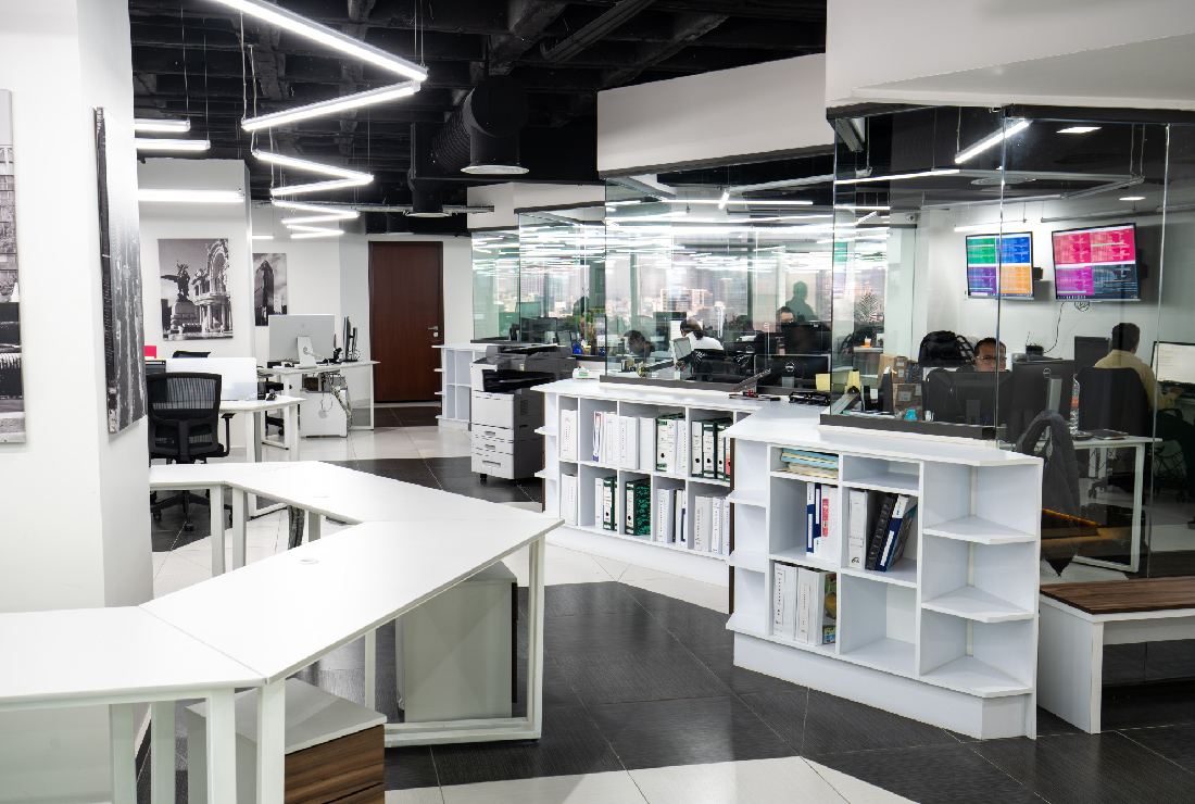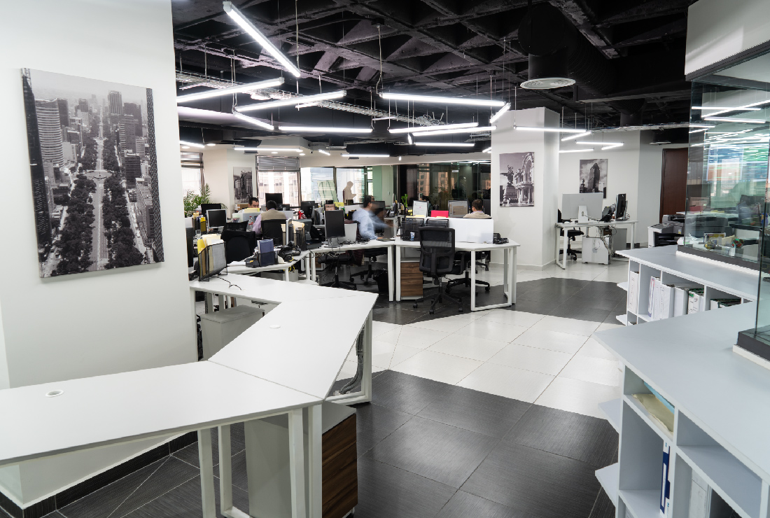 Desde el acceso principal se percibe claramente los materiales de alto diseño y la tecnología presente en la estancia, la paleta de colores que se seleccionó para todo el proyecto es sobria y predomina los colores neutros como el blanco y el negro, para crear ambientes luminosos y de amplitud, utiizando el material de porcelanato para el piso de la oficina. SPAZI pensó el diseño mobiliario modular para la interacción entre los trabajadores, con un estilo contemporáneo haciendo contraste el área de trabajo con iluminación en forma hexagonal con luz LED haciendo resaltar cada uno de los cubículos de esta forma creamos y optimizamos el área de trabajo, para que pueda crear un ambiente de flexibilidad en las instalaciones.