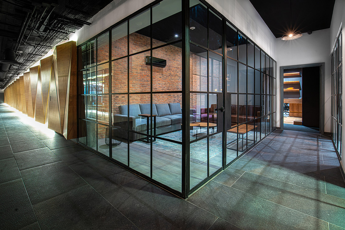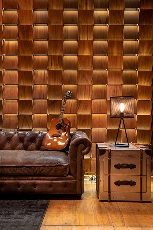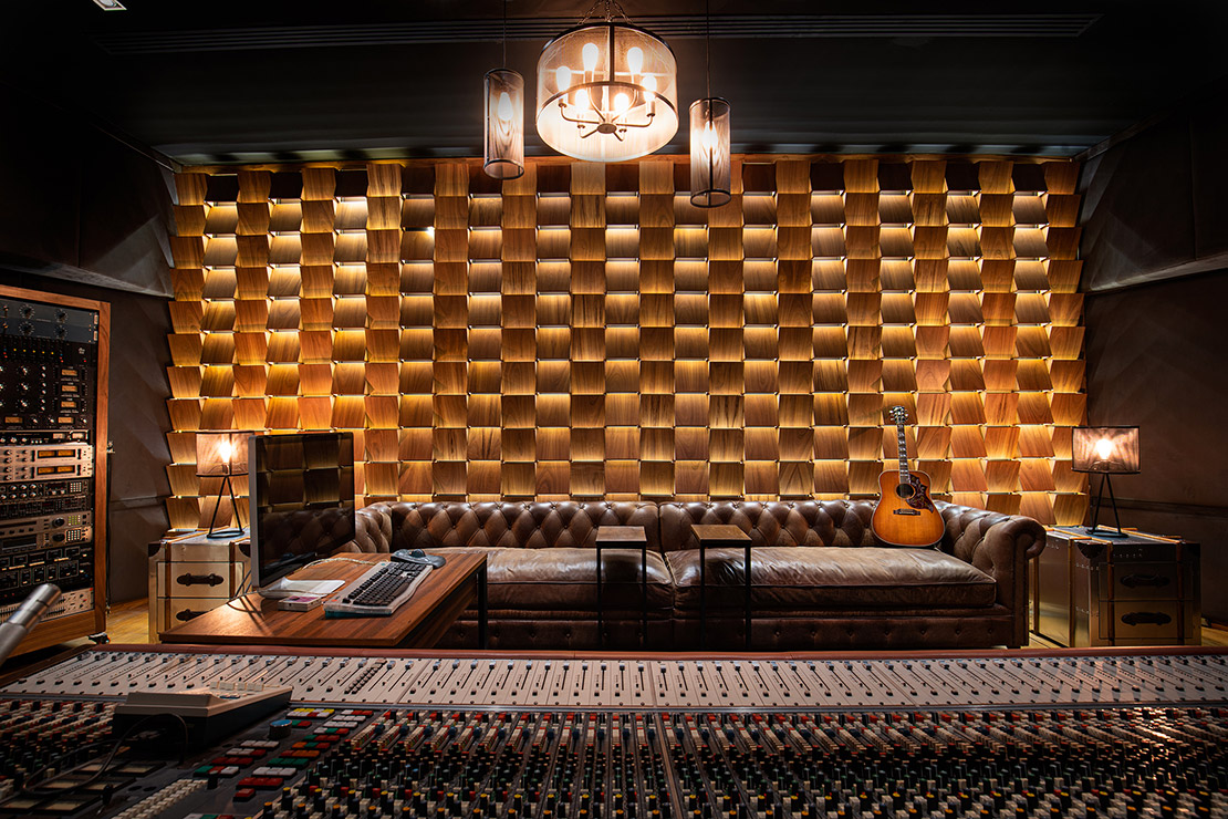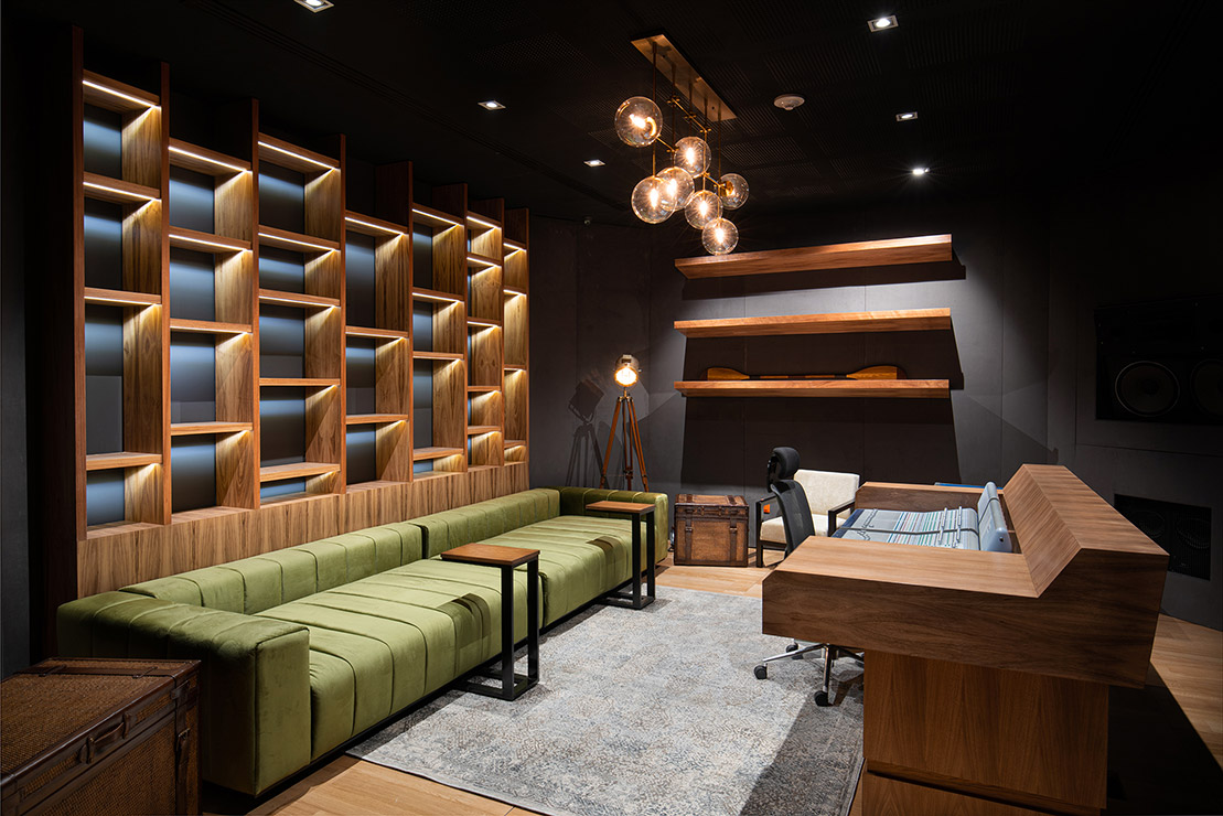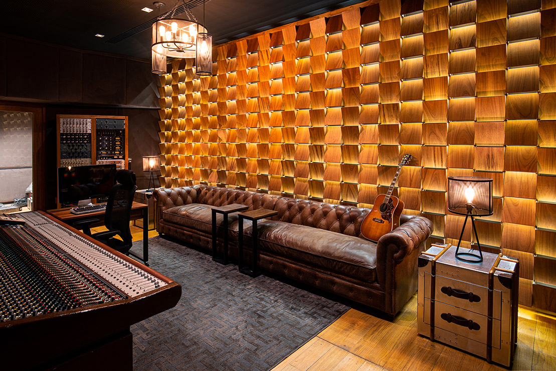 En cada espacio fue diseñado cada mueble en donde, se utilizaron materiales contemporáneos y en donde pensamos a través de la iluminación reflejar y apreciar una sensación de comodidad para los artistas. En el estudio se encuentra el pasillo que comunica las salas de grabación y se caracteriza por tener una iluminación indirecta, dramática, que sólo dirige la vista a través de las texturas en el lambrin de madera de tzalam sin duda un elemento que identifica el diseño del lugar, de igual manera una antigua bóveda se convirtió en un bar underground donde los artistas pueden brindar antes, durante y después de grabar en los estudios.