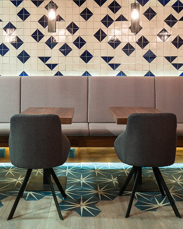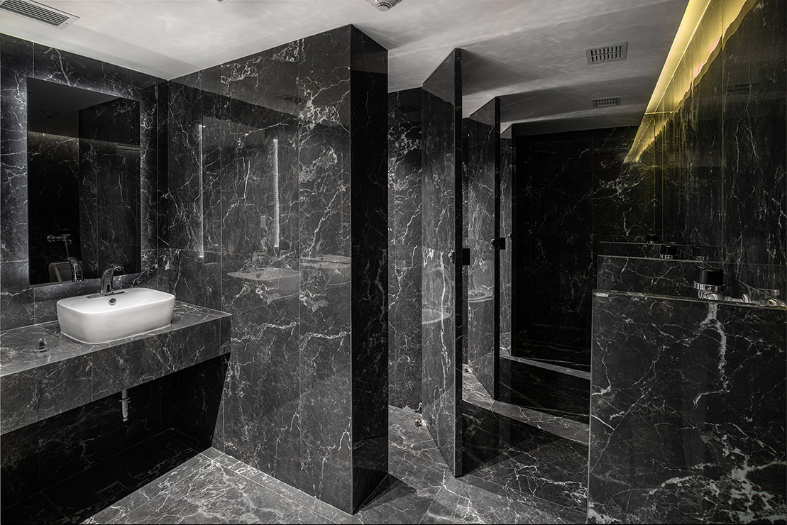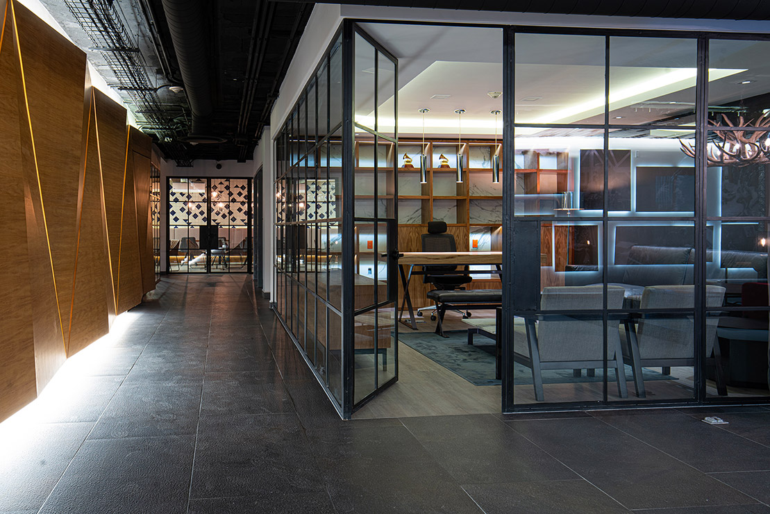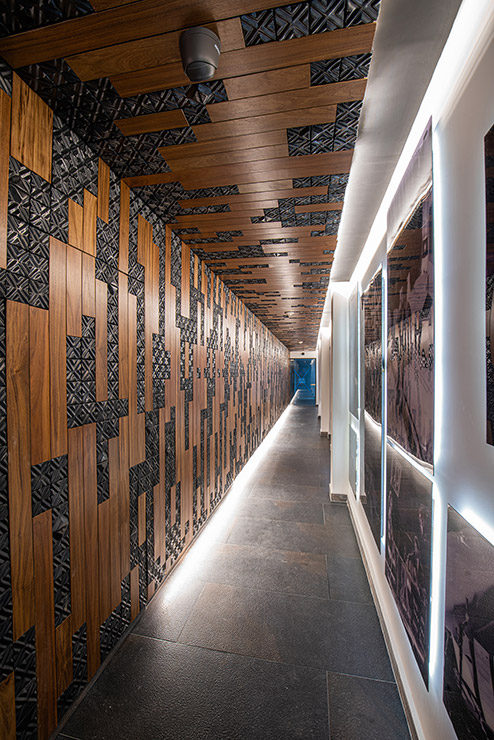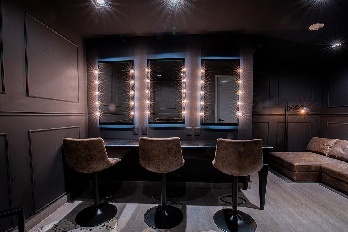 En cada espacio fue diseñado cada mueble en donde, se utilizaron materiales contemporáneos y en donde pensamos a través de la iluminación reflejar y apreciar una sensación de comodidad para los artistas. En el estudio se encuentra el pasillo que comunica las salas de grabación y se caracteriza por tener una iluminación indirecta, dramática, que sólo dirige la vista a través de las texturas en el lambrin de madera de tzalam sin duda un elemento que identifica el diseño del lugar, de igual manera una antigua bóveda se convirtió en un bar underground donde los artistas pueden brindar antes, durante y después de grabar en los estudios.