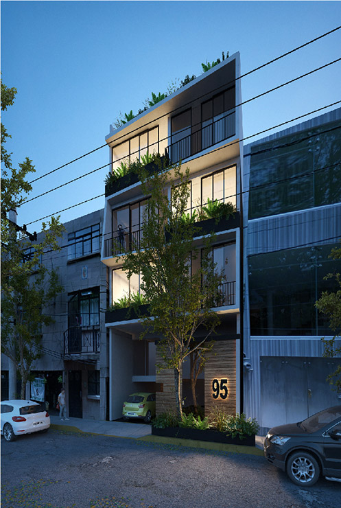 El Proyecto Residencial Santander ubicado en la colonia Nápoles, tiene una fachada moderna con una estructura contemporánea con madera y metal, una arquitectura que representa claramente el objetivo de su creación.